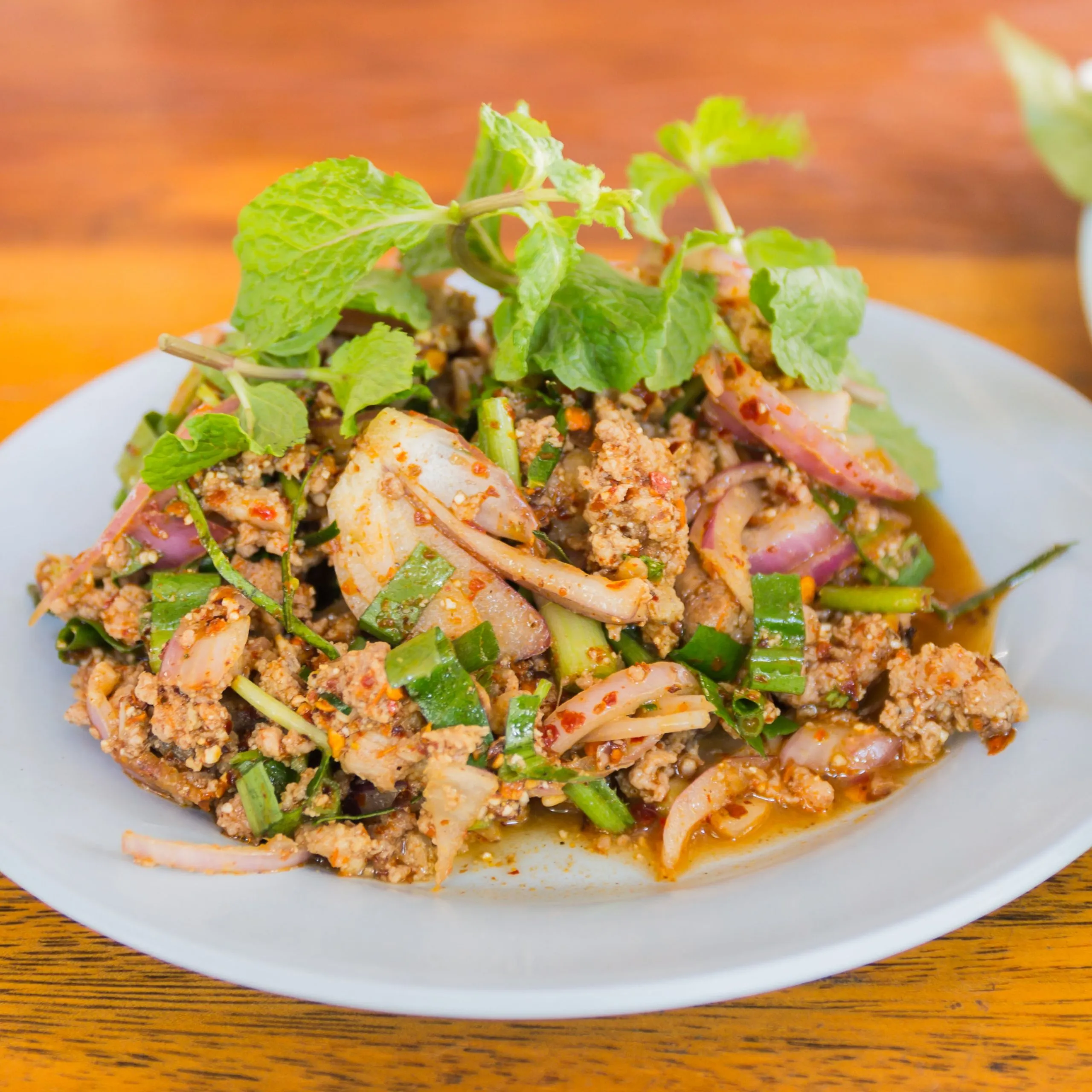 Tender Grilled Beef Slices With Fresh Mint, Red Onions, And Cucumber, Topped With A Light Sprinkle Of Herbs And Spices.