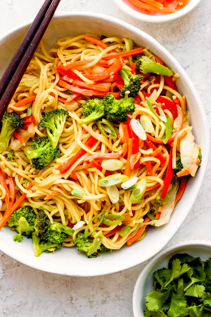 Yakisoba Noodles, Yellow Green Onions, Broccoli And Carrots