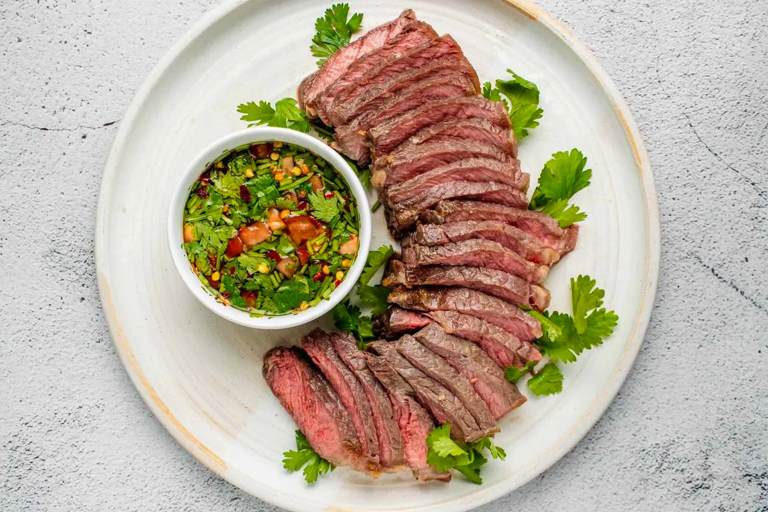Juicy, Grilled Beef Slices With A Savory, Caramelized Crust, Accompanied By A Spicy Dipping Sauce.